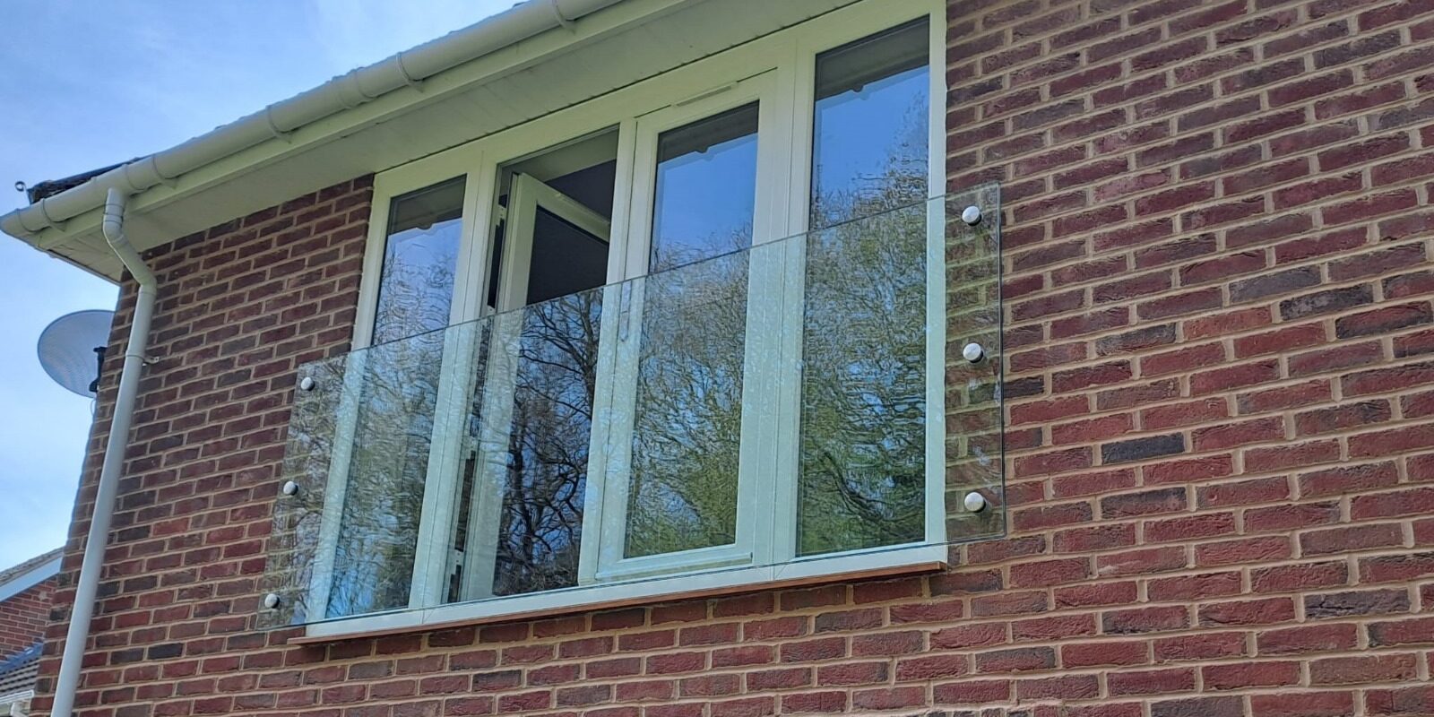 The customer in Codsall had first-floor French doors opening out onto the garden. They wanted the safety of a Juliet balcony, but not the visual bulk of railings or bars. We installed a single clear glass panel using stainless steel boss fixings, set neatly into the brickwork either side.